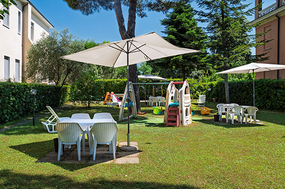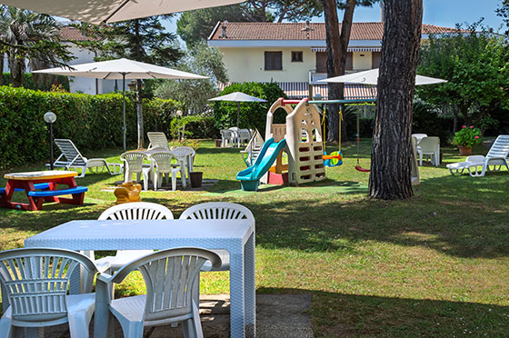 L'hotel, a 100 metri dal centro Marina di Massa, è un'oasi di tranquillità: immerso nel verde di un immenso giardino (2.000 mq) nel quale si alternano una zona "solarium" con lettini e ombrelloni, ed una zona "relax" con tavoli e sedie all'ombra di pini, magnolie e palme secolari. Una parte del giardino è adibita a parco giochi, e quindi riservata ai bambini. Sul retro dello stabile si trova un ampio parcheggio interno con chiusura notturna.
